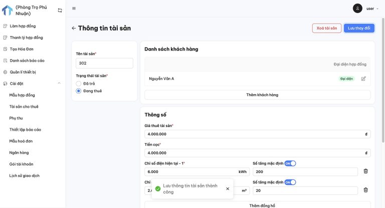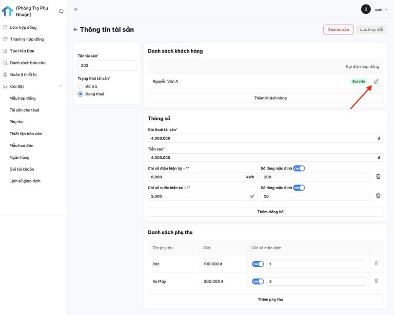 Bước 2: Chọn tài sản mà bạn muốn chỉnh sửa và cập nhật thông tin cần thay đổi: giá thuê, khách thuê mới, phụ thu… trực tiếp trên khu vực điền thông tin, sau đó nhấn “Lưu thay đổi”.