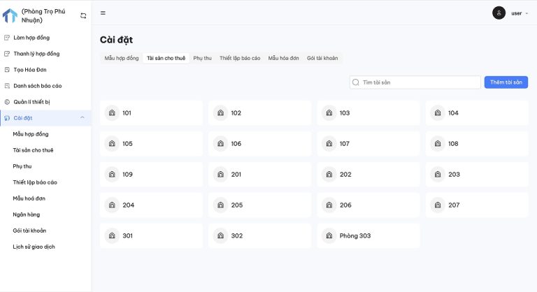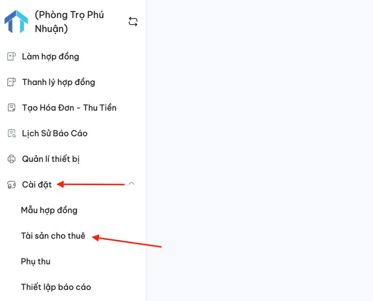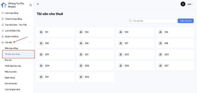 Tại thanh menu bên trái chọn “Cài đặt”, nhấn “Tài sản cho thuê”