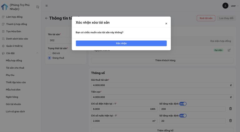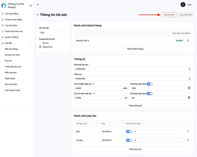 - Không nên xóa tài sản nếu tài sản đó vẫn đang có hợp đồng thuê đang hoạt động.