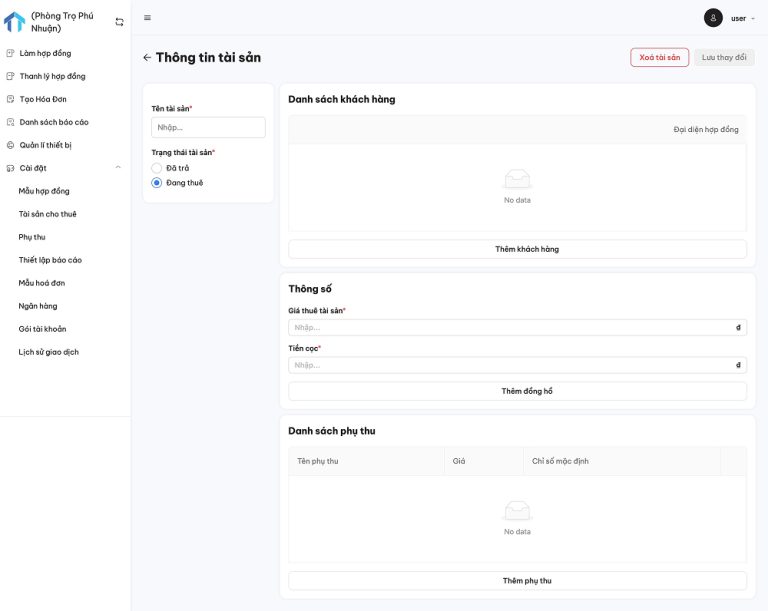 - Thêm tài sản: Chọn “Cài đặt” → Nhấn “Tài sản cho thuê” → Điền đầy đủ những thông tin đã chuẩn bị → Chọn “Lưu thay đổi”