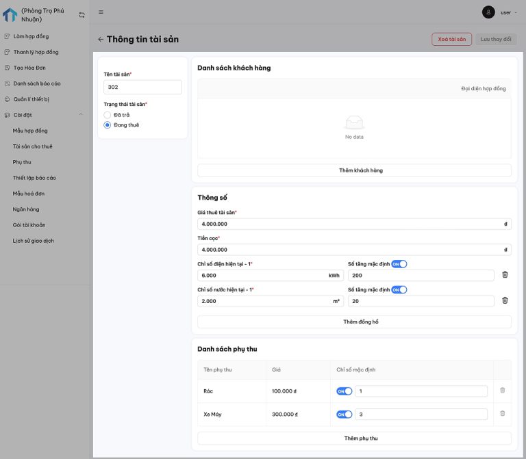 Bước 6: Thêm các khoản phụ thu vào tài sản như Internet, xe máy, dịch vụ…