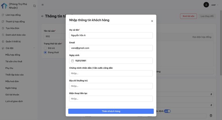 Khu vực điền thông tin khách hàng thuê tài sản