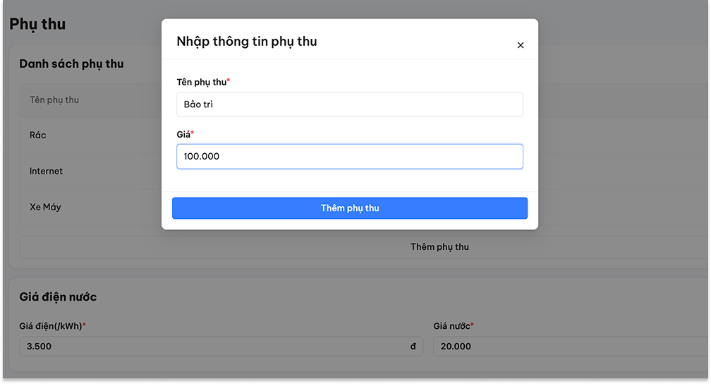 Lưu ý: Để có thể thêm phụ thu cho từng tài sản, bạn cần đảm bảo đã thiết lập mục “Phụ thu” trong tab “Cài đặt” trước đó.